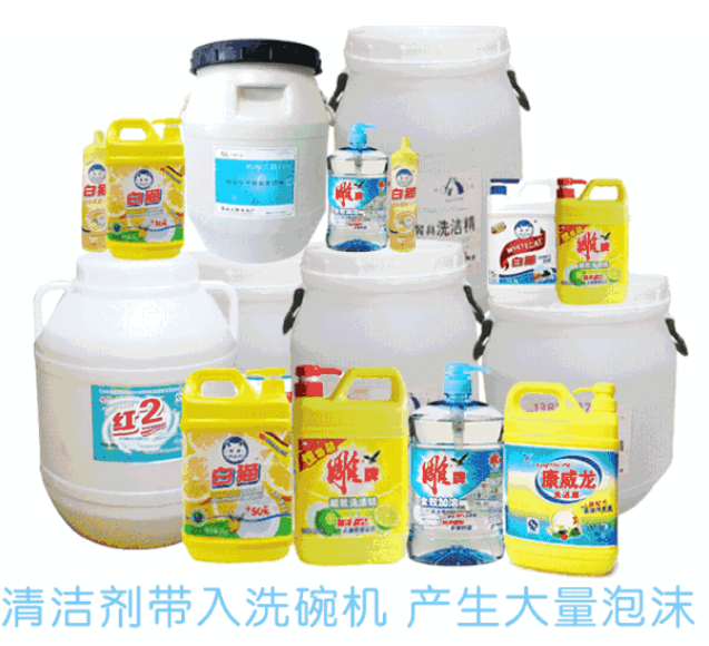 洗潔精是多種表面活性劑復(fù)合而成的清潔劑,特性是去油、去污,產(chǎn)生豐富、細(xì)膩的泡沫。在餐廳因為餐具數(shù)量太多,洗碗工如果不用花灑過水,那就會帶入大量洗潔精的稀釋液,累積起來,將是產(chǎn)生泡沫的罪魁禍?zhǔn)?。洗碗機(jī)的工作原理是:高溫,高壓,高堿,在強大的噴射水流對沖下,水槽內(nèi)一定會產(chǎn)生大量泡沫。因洗碗機(jī)清潔劑自帶去油功能,所以,在前期預(yù)處理餐具時,用少量洗潔精即可。