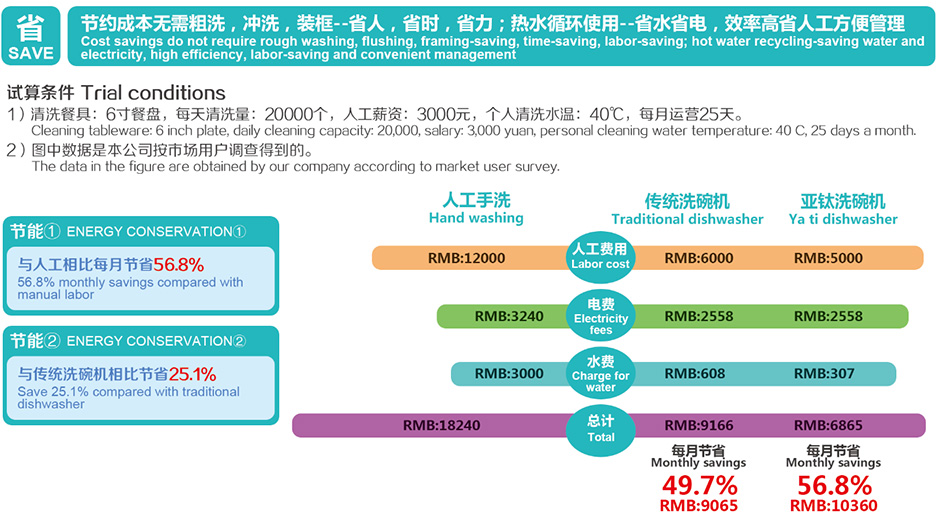 亞鈦洗碗機(jī)性能卓越:(異型餐具通洗,360℃無死角噴洗) ,獨(dú)立高溫水箱(確保高溫80℃消菌清洗) ,首創(chuàng)餐具軟壓帶(真正實(shí)現(xiàn)餐具零破損),集“粗洗,漂洗,清洗,風(fēng)干”多功能一體,內(nèi)置水循環(huán)系統(tǒng)(保證設(shè)備省電節(jié)水),后端獨(dú)立風(fēng)機(jī)(確保餐具零水分),達(dá)到無與倫比的洗滌效果,大大節(jié)約能耗。